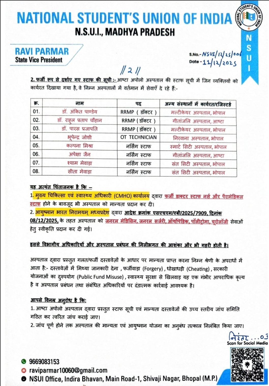 शिकायत में कहा गया है कि आष्टा अपोलो अस्पताल ने फर्जी स्टाफ दिखाकर, गलत दस्तावेज़ प्रस्तुत कर अस्पताल की मान्यता तथा आयुष्मान योजना का अनुबंध प्राप्त किया है, जबकि वास्तविकता में सूची में दर्ज डॉक्टर, नर्सिंग स्टाफ और पैरामेडिकल कर्मचारी — भोपाल और सीहोर के अन्य अस्पतालों में कार्यरत हैं।