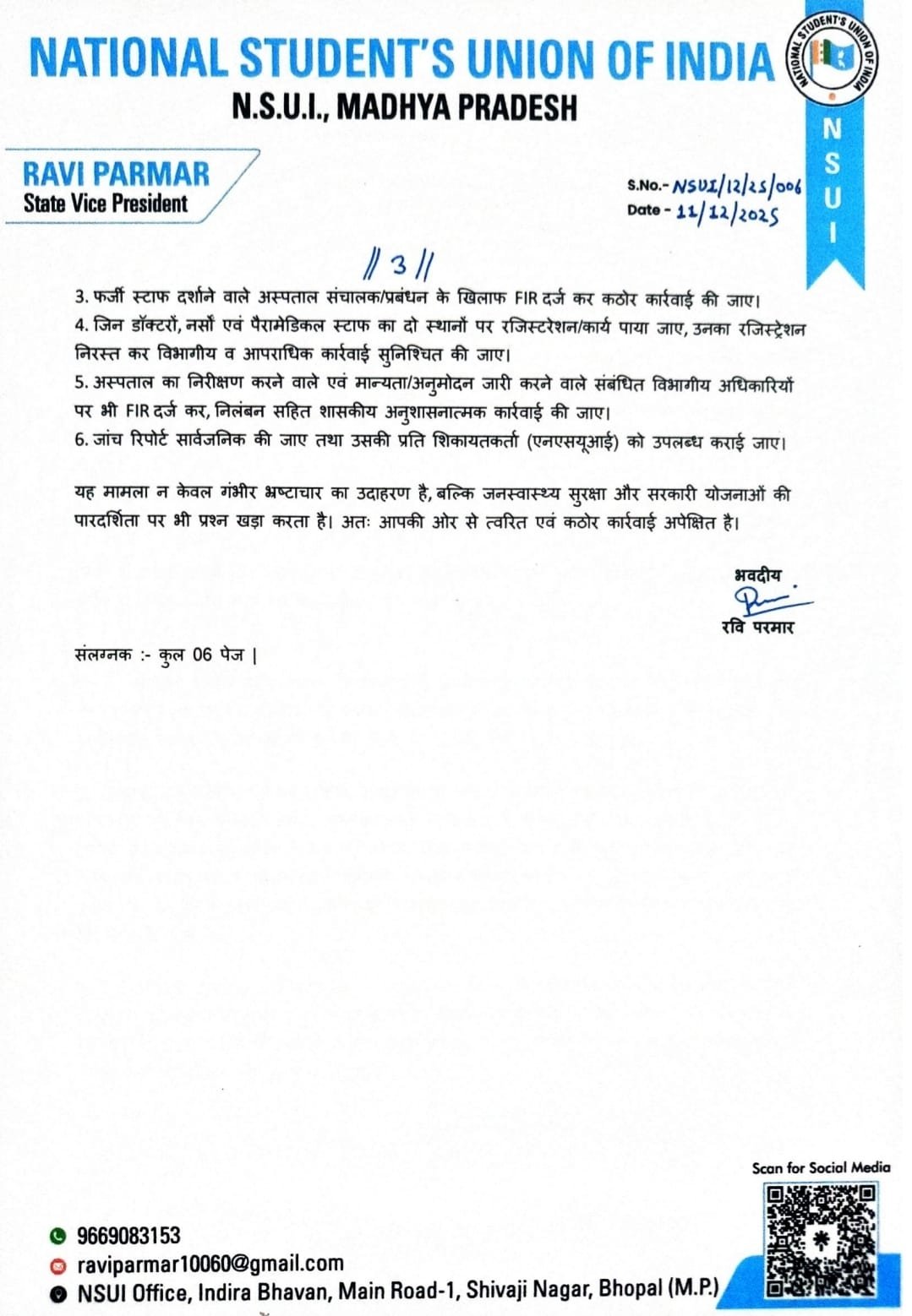 परमार ने स्पष्ट किया है कि यदि इस गंभीर भ्रष्टाचार पर तत्काल कार्रवाई नहीं की जाती, दोषियों पर FIR दर्ज नहीं होती और अस्पताल की मान्यता रद्द नहीं होती — तो NSUI सड़क पर उतरकर उग्र आंदोलन शुरू करेगी ।